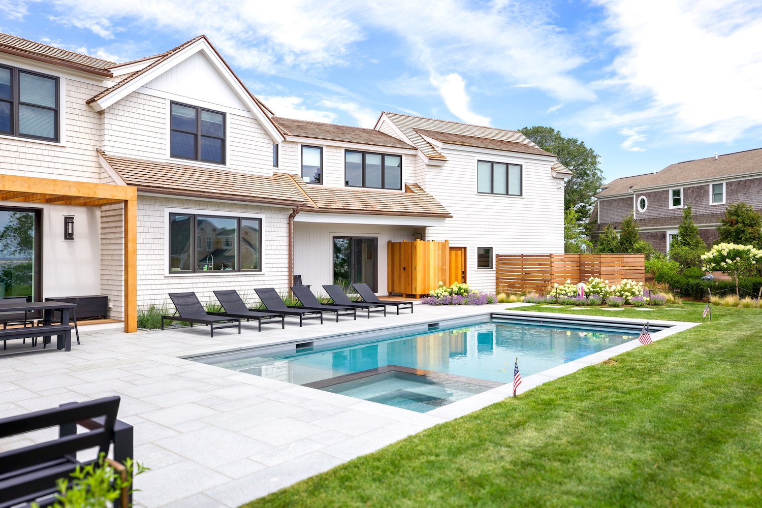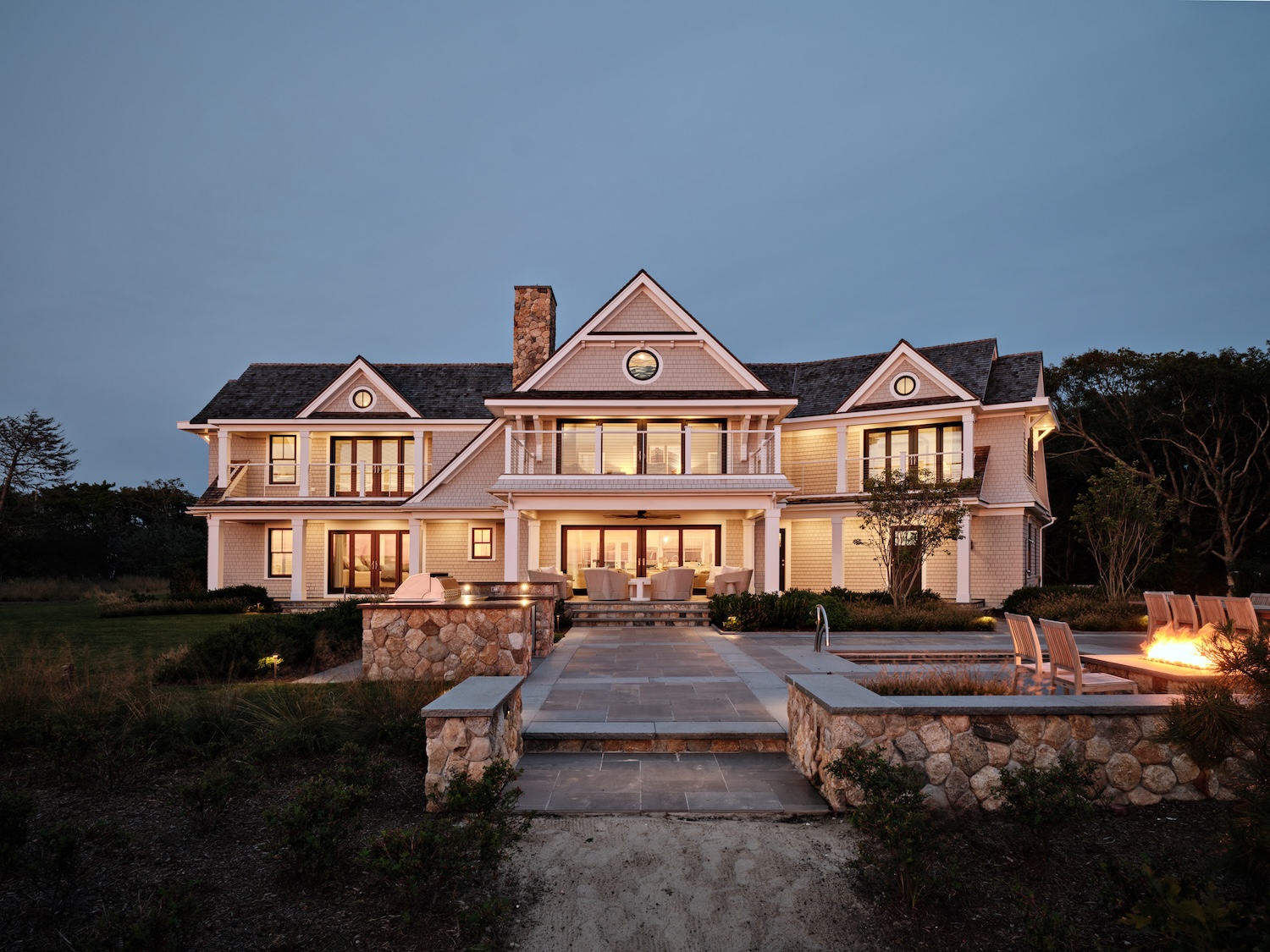 Set at the far end of a sandy island off of South Yarmouth is a home designed with gathering in mind. A landscape designed with the same goal complements it perfectly.