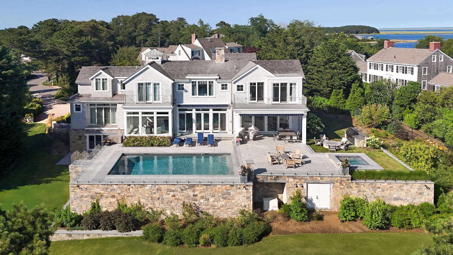 With common materials incorporated in both the house and landscaping, the overall look of this new Shingle-style home and the surrounding acreage is cohesive and filled with rich texture.